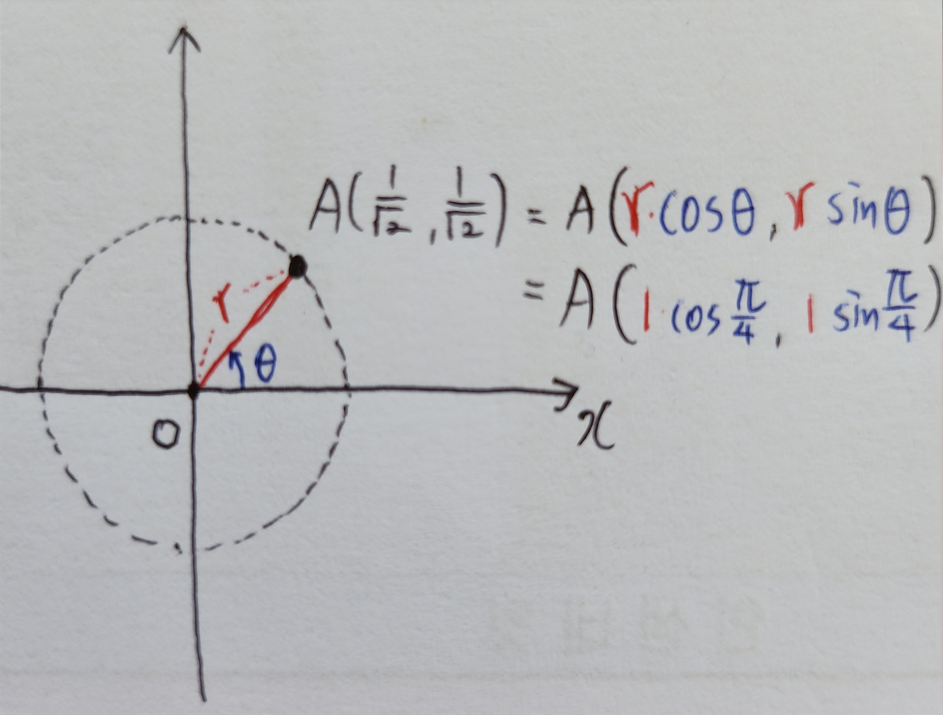 극좌표계는 좌표평면 위의 점(x, y)을 원점과 이은 길이 r, x축의 양의 방향으로부터 점까지의 동경 (세타)로 표현하는 방법이다. (아래 예시와 같이)
