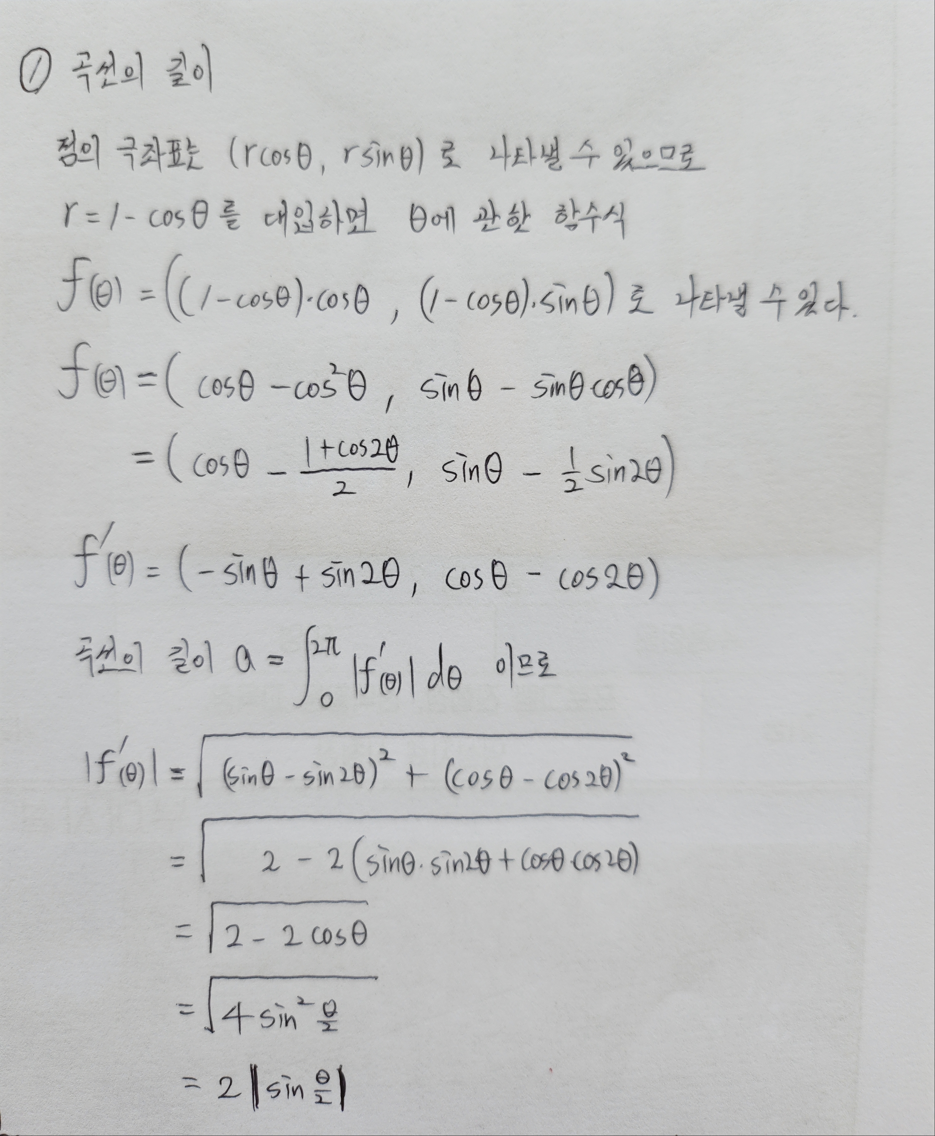 곡선의 길이를 구하니 힘이 들어 넓이는 다음에 구해야겠다. 영역의 넓이는 x와 y에 관한 이중적분으로 해결해야 하며 r과 세타로 변수변환을 하면서 자코비값을 곱해주고 적분계산을 하면 된다. 풀어보아라.